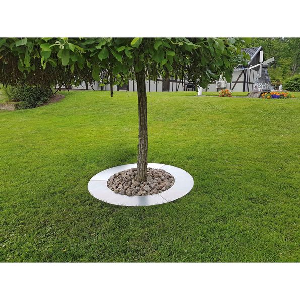 En praktisk och dekorativ trädring för robotgräsklippare i råplåt. Råplåt rostar efterhand till en fin patina.
