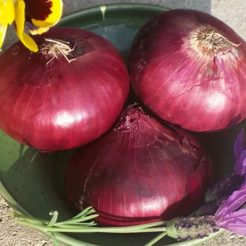 Stora, runda, mörkröda lökar. Mycket god och dekorativ i sallader, inläggningar m.m. Utmärkta lagringsegenskaper.