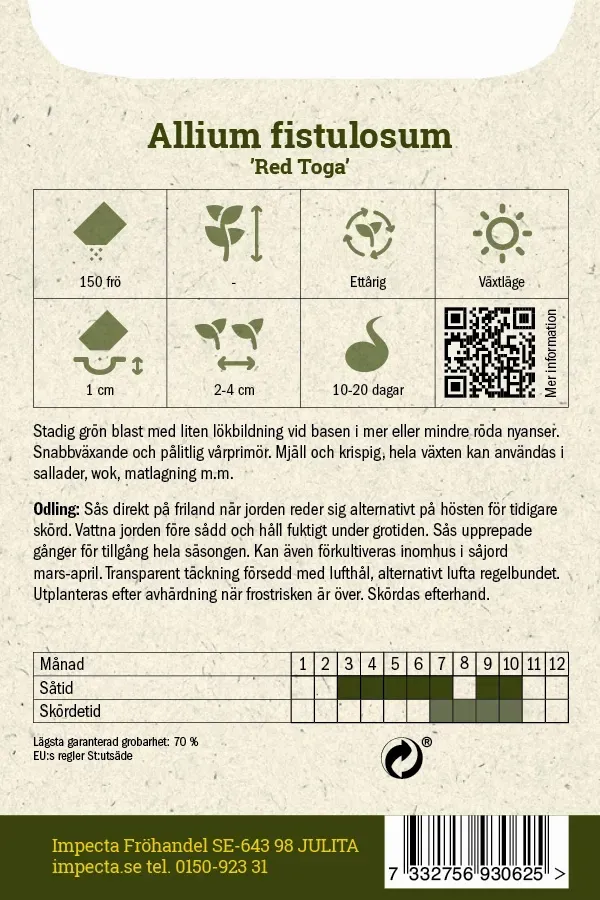 Stadig grön blast med liten lökbildning vid basen i mer eller mindre röda nyanser. Snabbväxande och pålitlig vårprimör. Mjäll och krispig, hela växten kan användas i sallader, wok, matlagning m.m. Odling från frö: Sås direkt på friland när jorden reder sig alternativt på hösten för tidigare skörd. Vattna jorden före sådd och håll fuktigt under grotiden. Sås upprepade gånger för tillgång hela säsongen. Kan även förkultiveras inomhus i såjord mars-april. Transparent täckning försedd med lufthål, alternativt lufta regelbundet. Utplanteras efter avhärdning när frostrisken är över. Skördas efterhand. Portionsmängd: 150 frö Utvecklingstid, dagar: 65 Växtläge: sol Färg: Röd Såtid: mars-juli/sep-okt Grotid: 10-20 dagar Blomtid/Skördetid: juli-okt Årighet: Ettårig Engelskt namn: Spring Onion
