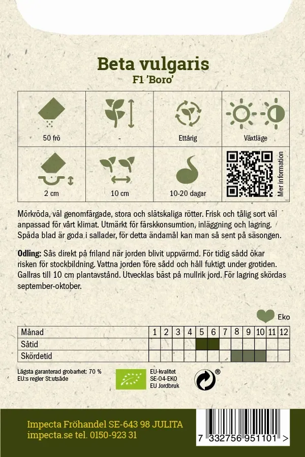 Mörkröda, väl genomfärgade, stora och slätskaliga rötter. Frisk och tålig sort väl anpassad för vårt klimat. Utmärkt för färskkonsumtion, inläggning och lagring. Späda blad är goda i sallader, för detta ändamål kan man så sent på säsongen.