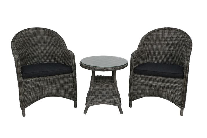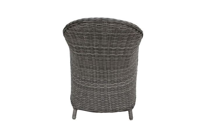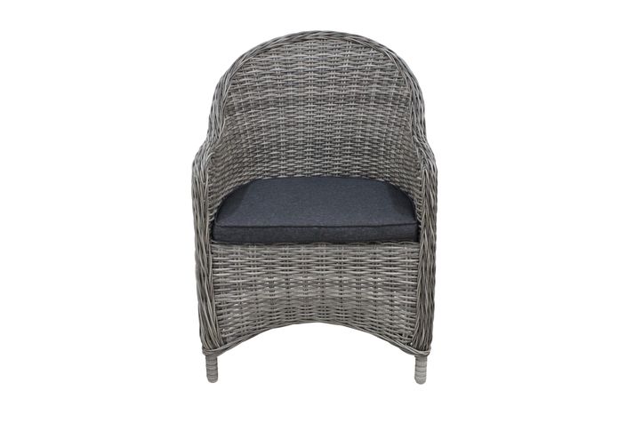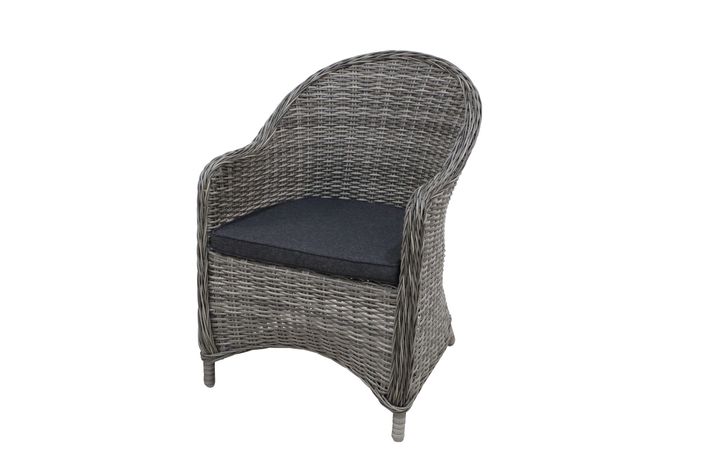 En klassiska fåtölj, tillverkad av halvrund konstrotting och en stomme av aluminium. Sittdyna ingår i mörk granitfärgad polyester. Ryggdyna finns som tillval.