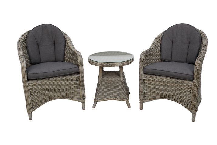 Sidobord i mörk naturfärgad konstrotting och stomme av aluminium.
