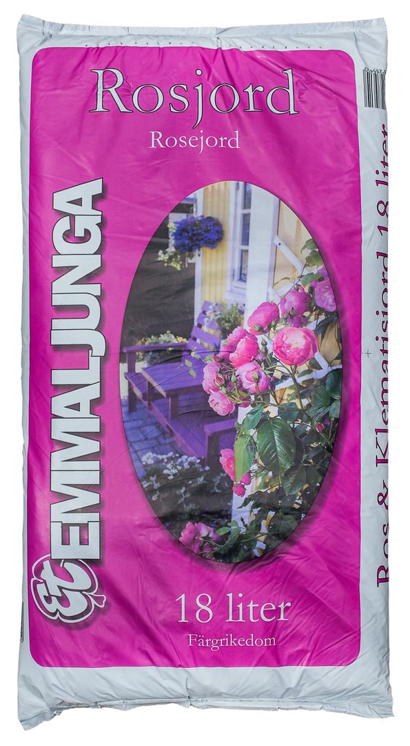 Rosjord 18 liter. En gödslad jordblandning med lera och neturlig kogödselkompost. Solklar till alla rosor, klematis och pelargoner i trädgården. Plantera direkt i jorden, eller använd som förbättring i trötta jordar. Kiselrik lera och kogödselkompost. NPK 11-5-18 + micronäring i lämplig giva. pH på 5,5-6,5. Finns även i 50 L.