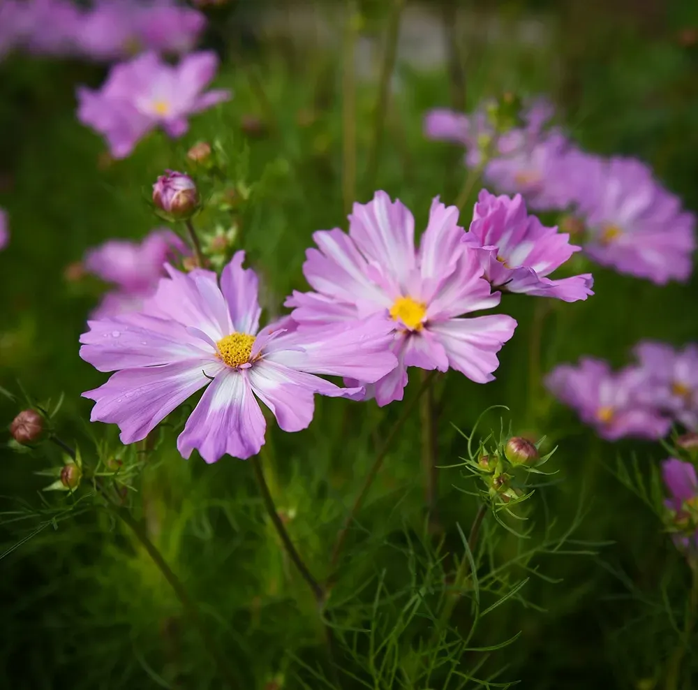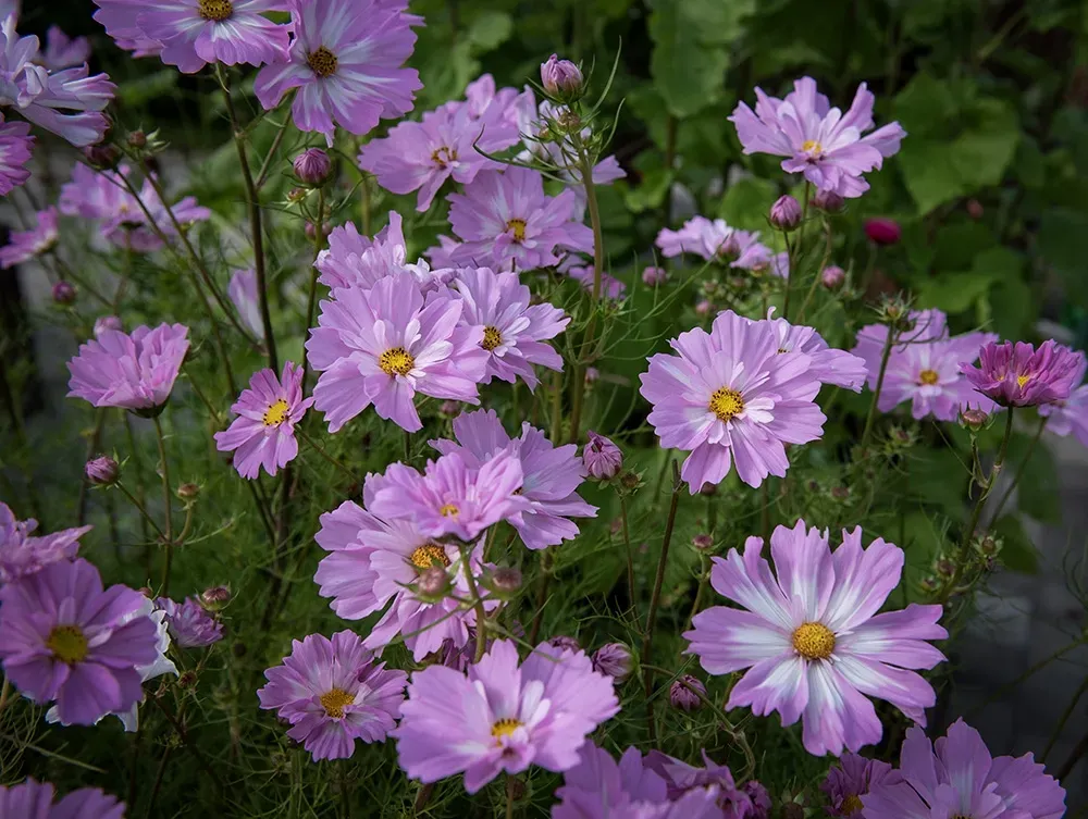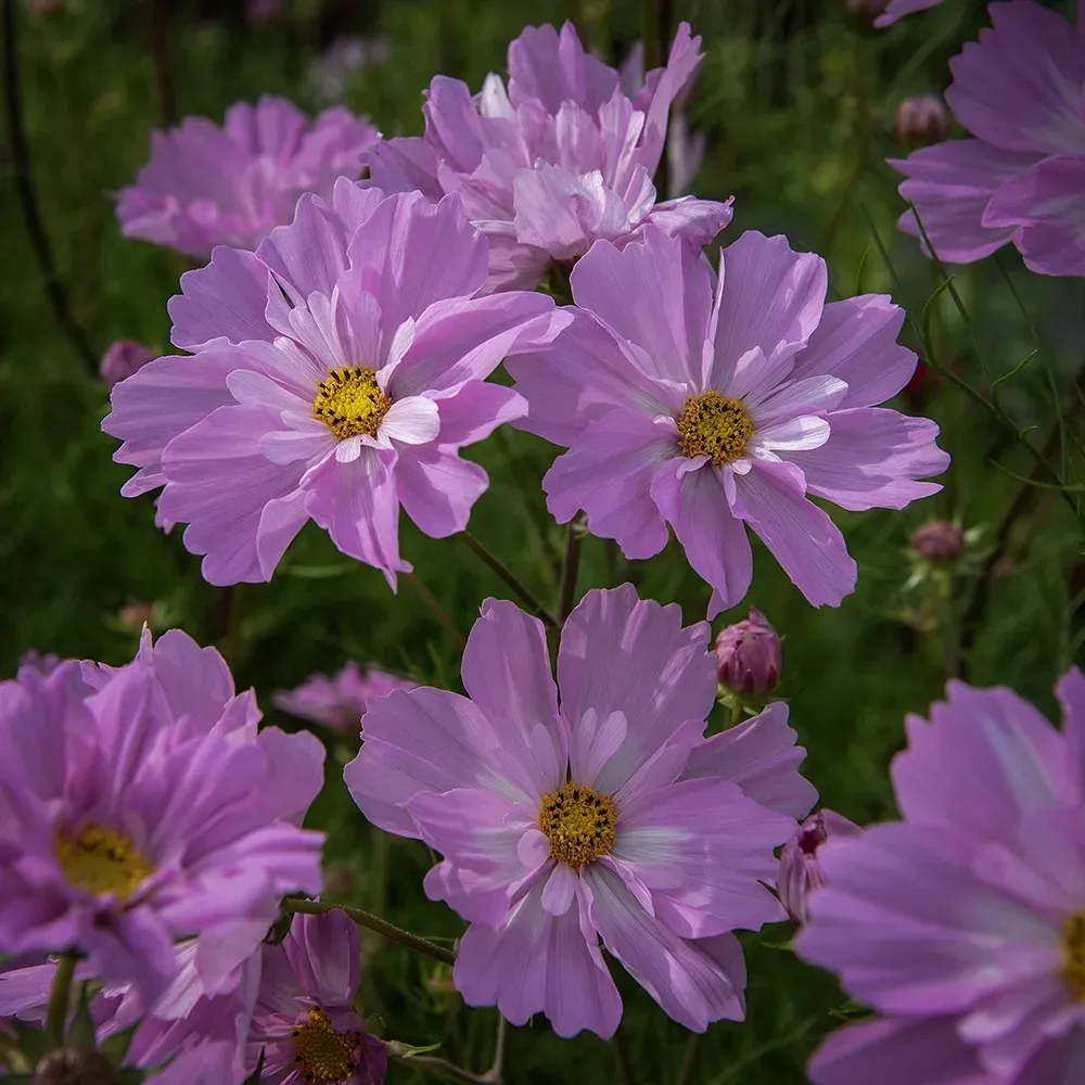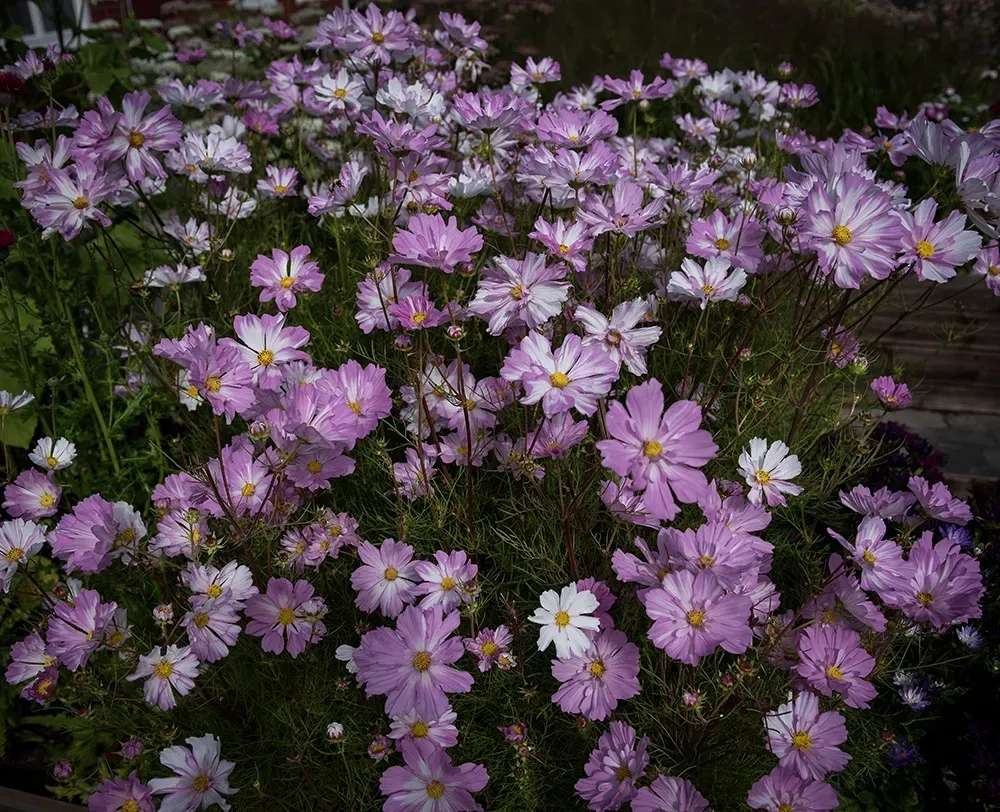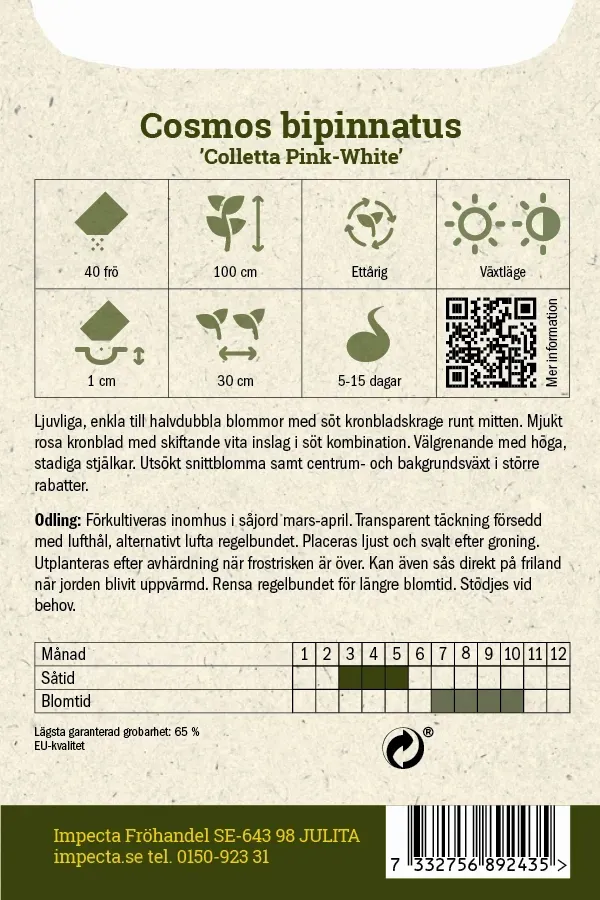 Ljuvliga, enkla till halvdubbla blommor med söt kronbladskrage runt mitten. Mjukt rosa kronblad med skiftande vita inslag i söt kombination. Välgrenande med höga, stadiga stjälkar. Utsökt snittblomma samt centrum- och bakgrundsväxt i större rabatter.