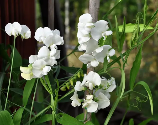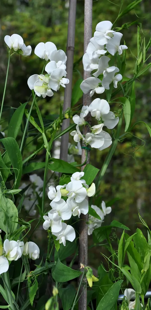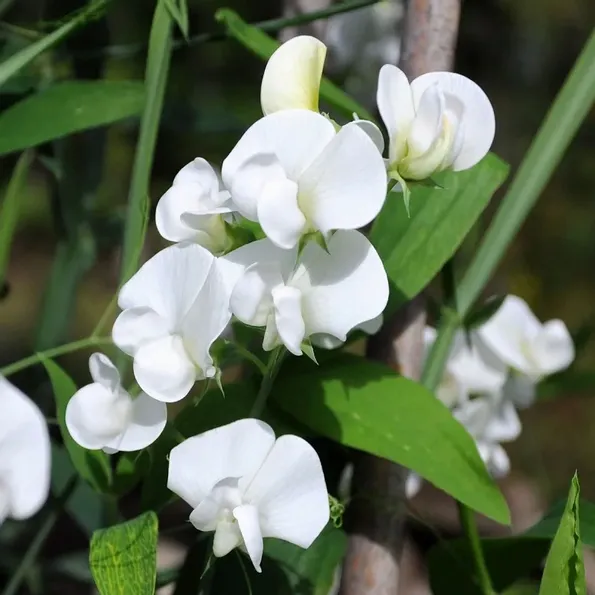 Flerårig ärtväxt med pärlemorvita blommor. Rikblommande med flera blommor på varje stjälk. Slingrande växtsätt för spaljé, murar och liknande. Perenn som blommar fint redan första året.