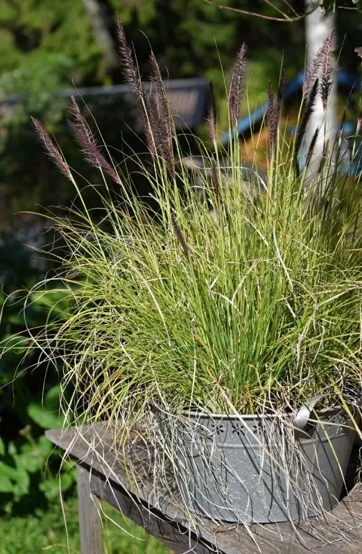 Sirligt, fräscht vårgrönt prydnadsgräs i stora tuvor. Får på sensommaren stora, rubinröda ax som svävar över planteringen. Mycket dekorativ och användbar i samplanteringar, krukor och till snitt.