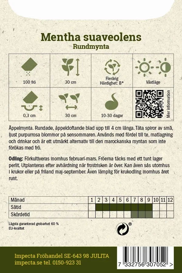 Förkultiveras inomhus februari-mars. Fröerna täcks med ett tunt lager perlit. Utplanteras efter avhärdning när frostrisken är över. Kan även sås utomhus i krukor eller på friland maj-september. Även lämplig för krukodling inomhus året runt. Benämns även som: Äppelmynta.