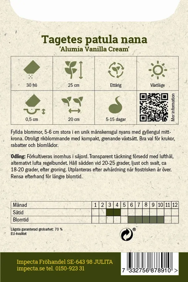 Fyllda blommor, 5-6 cm stora i en unik månskensgul nyans med gyllengul mittkrona. Otroligt rikblommande med kompakt, grenande växtsätt. Bra val för krukor, rabatter och blomlådor. Odling från frö: Förkultiveras inomhus i såjord. Transparent täckning försedd med lufthål, alternativt lufta regelbundet. Håll sådden vid 20-25 grader, ljust och svalt, ca 18-20 grader, efter groning. Utplanteras efter avhärdning när frostrisken är över. Rensa efterhand för längre blomtid. Portionsmängd: 30 frö Växtläge: sol Höjd: 25 cm Färg: Gul Såtid: mars-april Grotid: 5-15 dagar Blomtid/Skördetid: juni-okt Årighet: Ettårig