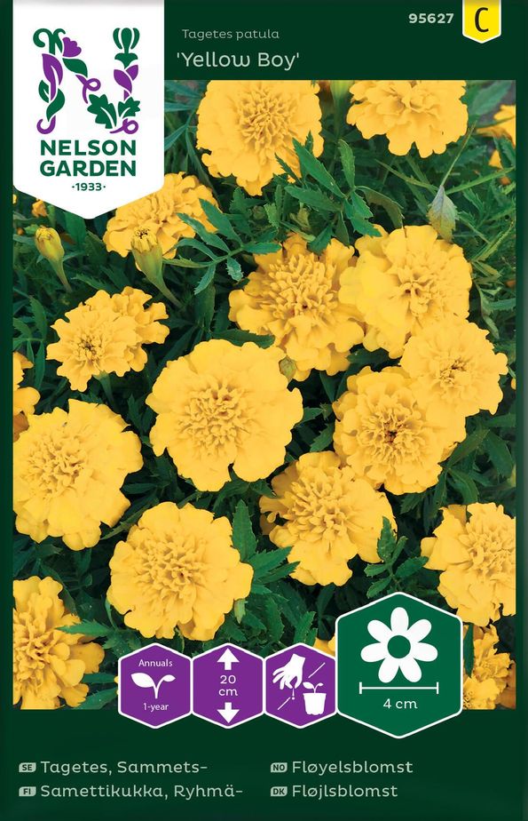 Denna tagetes ifrån boy-serien producerar massor av 4 centimeter stora, fyllda, citrongula blommor. Boy-tagetes har funnits i många år och imponerar med sitt kompakta växtsätt och vädertålighet. Sorten blir 20 cm hög, blommar tidigt och fortsätter att blomma fram till hösten. 'Yellow boy' är vacker att plantera längs med rabattkanter och i köksträdgården. Pålitlig att odla i kruka. Trivs i välgödslad jord men är anspråkslös. Lättodlad och tål både regn och en del frost. Ta bort vissna blommor efterhand för att stimulera plantan till rikligare blomning.