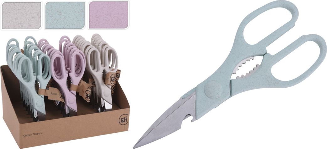 Rejäl kökssax som är tillverkad av risskalsfiber och bladen av 430 rostfritt stål.