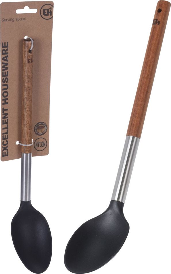 Stilren och funktionell serveringsslev med robust skopa i rostfritt stål och greppvänligt handtag i naturligt trä.