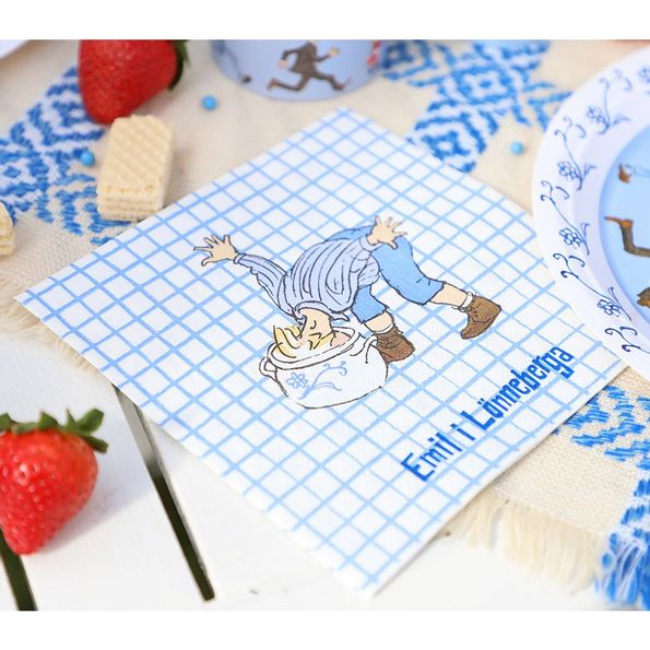 Tre lagersservett i storlek 33 x 33 cm med festligt Emil motiv. Perfekt att använda som servett på Emilkalaset eller för att sätta lite färg till dukningen.