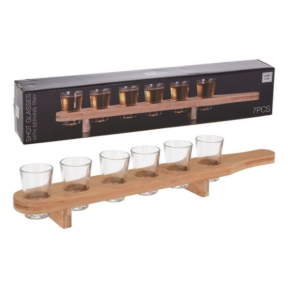 Snyggt shotglas set med 6 shotglas på 40 ml styck och en serveringsbräda i trä.