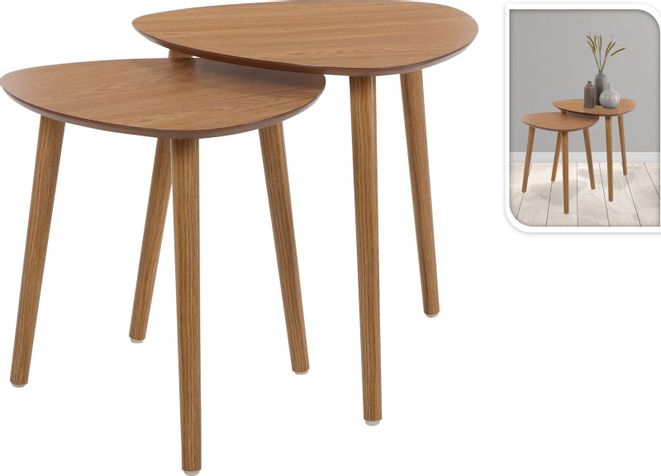 Fint set med 2 sidobord med ben i massivt trä och toppskiva i träimitation.