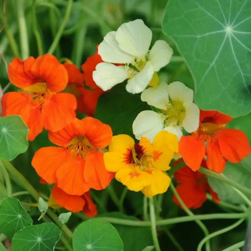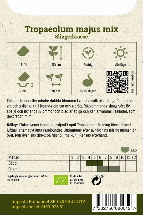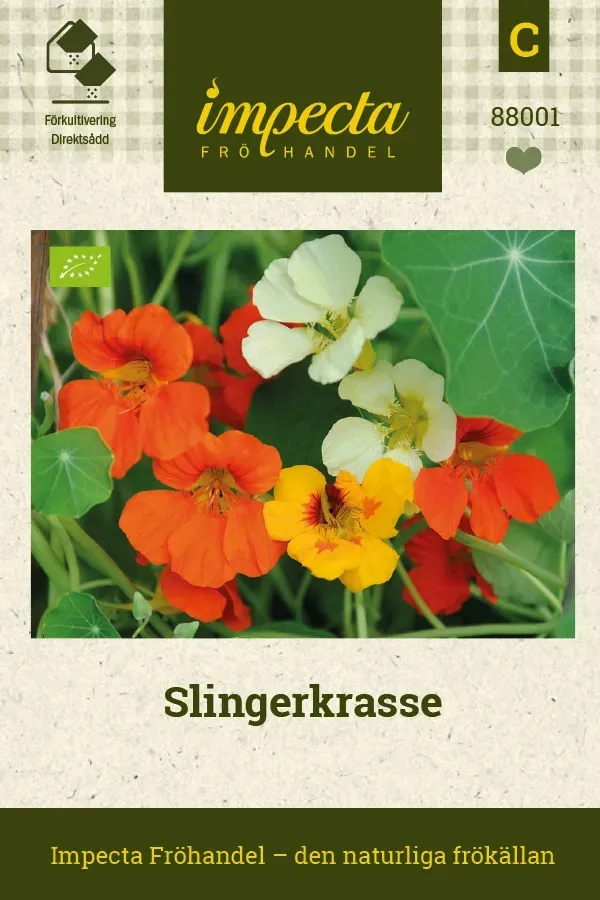 Enkla och mer eller mindre dubbla blommor i variationsrik blandning från cremevitt och gyllengult till lysande orange och eldrött. Rikblommande slingerväxt för spaljé och liknande. Blommor och blad är ätliga och kan användas i sallader, som dekoration m.m.