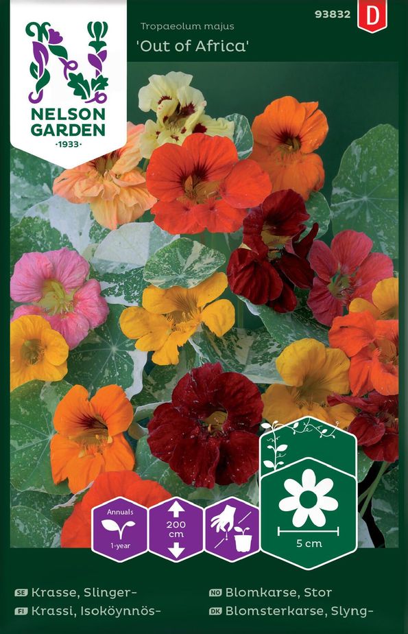 Slingerkrasse/ indiankrasse 'Out of Africa' är en underbar slingrande sommarblomma med vitstrimmiga blad och blommor i olika nyanser av gult, orange och rött. Sommarens sallader får en härlig färgklick om man tillsätter de ätliga blommorna och även fröna kan ätas om de skördas omogna och läggs in på samma sätt som kapris. De inlagda fröerna kan användas som tillbehör till både kött och fisk. Slingerkrassen blir upp till 2 meter hög och är fin att odla i ampel, som marktäckare eller som klätterväxt mot en spaljé. I samplantering med andra blommor eller med grönsaker slingrar den vackert runt de andra växterna och lyser upp med sina färgglada blommor och frodiga bladverk. Slingerkrasse är lättodlad men för mesta blomrikedom bör den odlas i mager jord. Är jorden allt för näringsrik kommer bladen att utvecklas på bekostnad av blommorna. Fröna läggs med fördel i blöt i ljummet vatten ett dygn före sådd för snabbare groning. Krasse kan både förodlas inomhus och direktsås på växtplatsen. Den är dock mycket känslig för frost så utplantering bör ske när frostrisken är över.