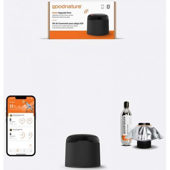 Detta paket ansluter din Goodnature-fälla till din smartphone via Bluetooth. Vrid på locket på fällan och ladda ner den kostnadsfria Goodnature-appen. I appen kan du se hur många råttor eller möss som fällan har kontrollerat, tid, temperatur och plats. Du kan även få ett meddelande när fällan har löst ut eller dela data från dina fällor med andra. Dessutom kan du i appen för varje fälla se hur länge CO2-patronen och betet räcker. Den innehåller också en CO2-patron och bete.