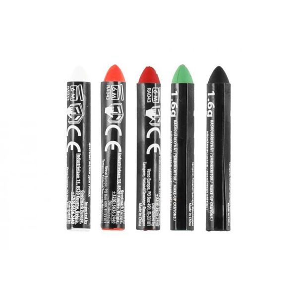 Sminkkritor i färgkombinationerna: svart, vit, röd, orange och grön.