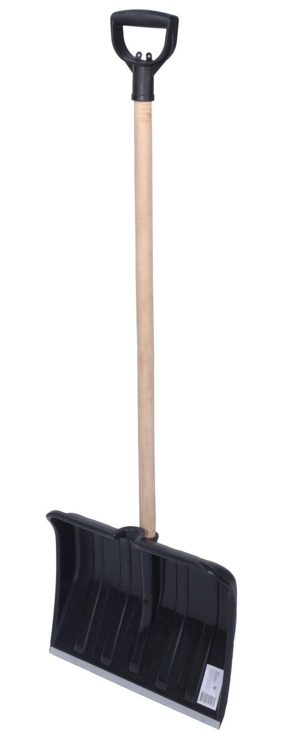 Svart snöskyffel med skaft i trä och ett svart plasthandtag.