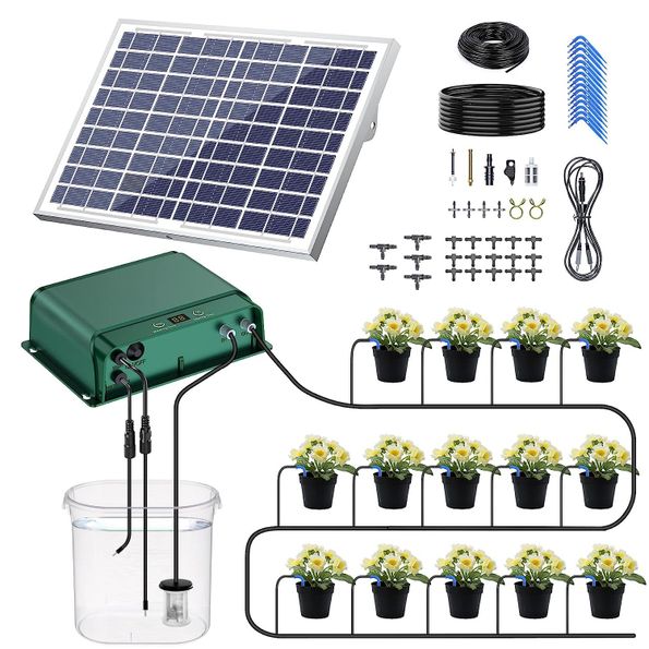 Soldrivet bevattningssystem för upp till 20 krukor. Batteriet laddas enkelt upp med solenergi. Perfekt för krukor, växthus, rabatt eller trädgårdsland.