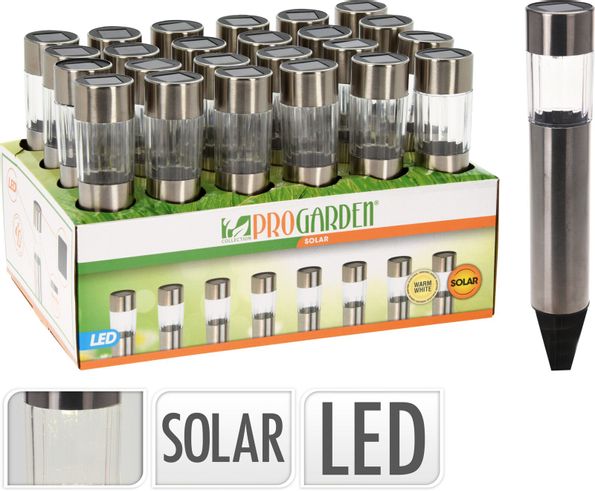 Solcellsdriven LED-lampa i rostfritt stål med jordspjut i svart plast.