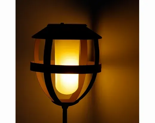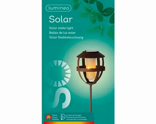 Fackla i rostfärgad metall som drivs av solceller och lyser i en fin varmvit, flammande effekt.