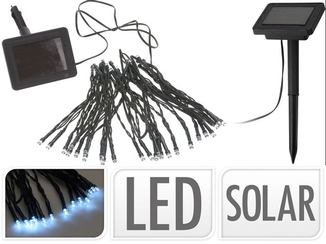 Solcellsdriven ljusslinga med 50 LED-lampor som lyser i varmvitt ljus.