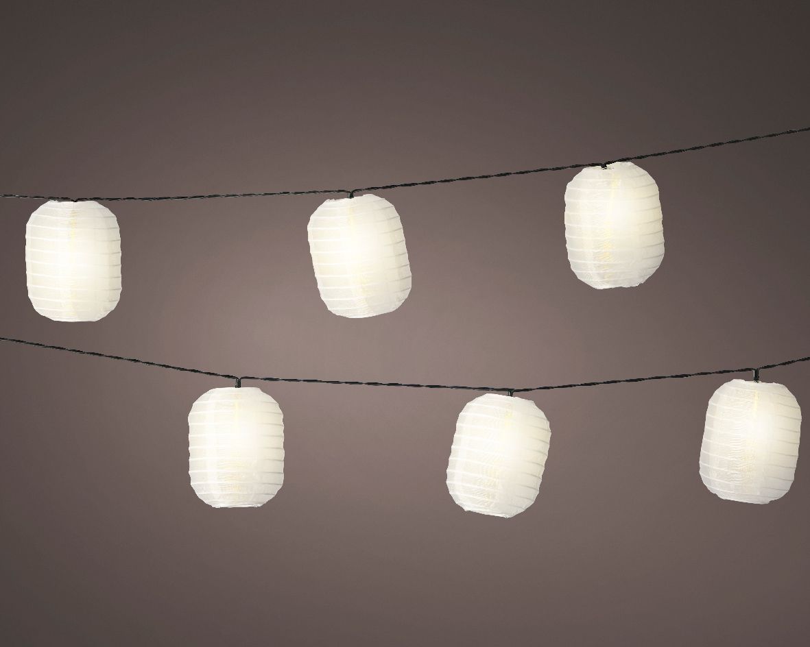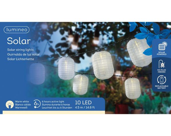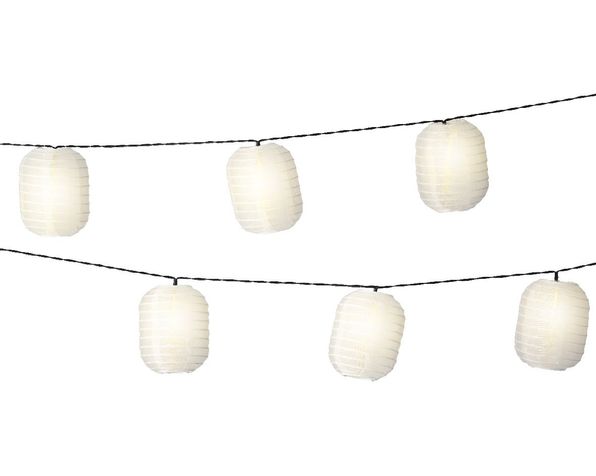 Ljusslinga som drivs med solceller. Förpackningen innehåller 1 slinga med 10 lanternor. Varmvitt sken. Färg: Vita lanternor, svart sladd.