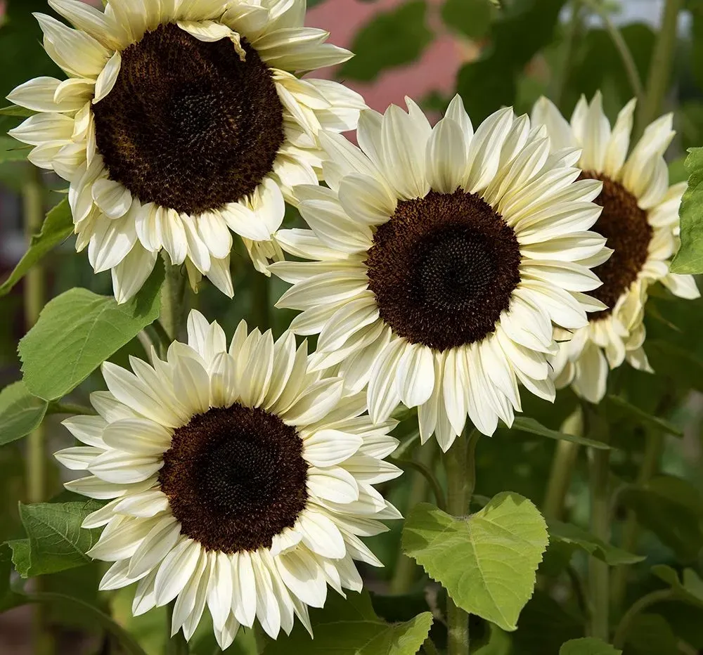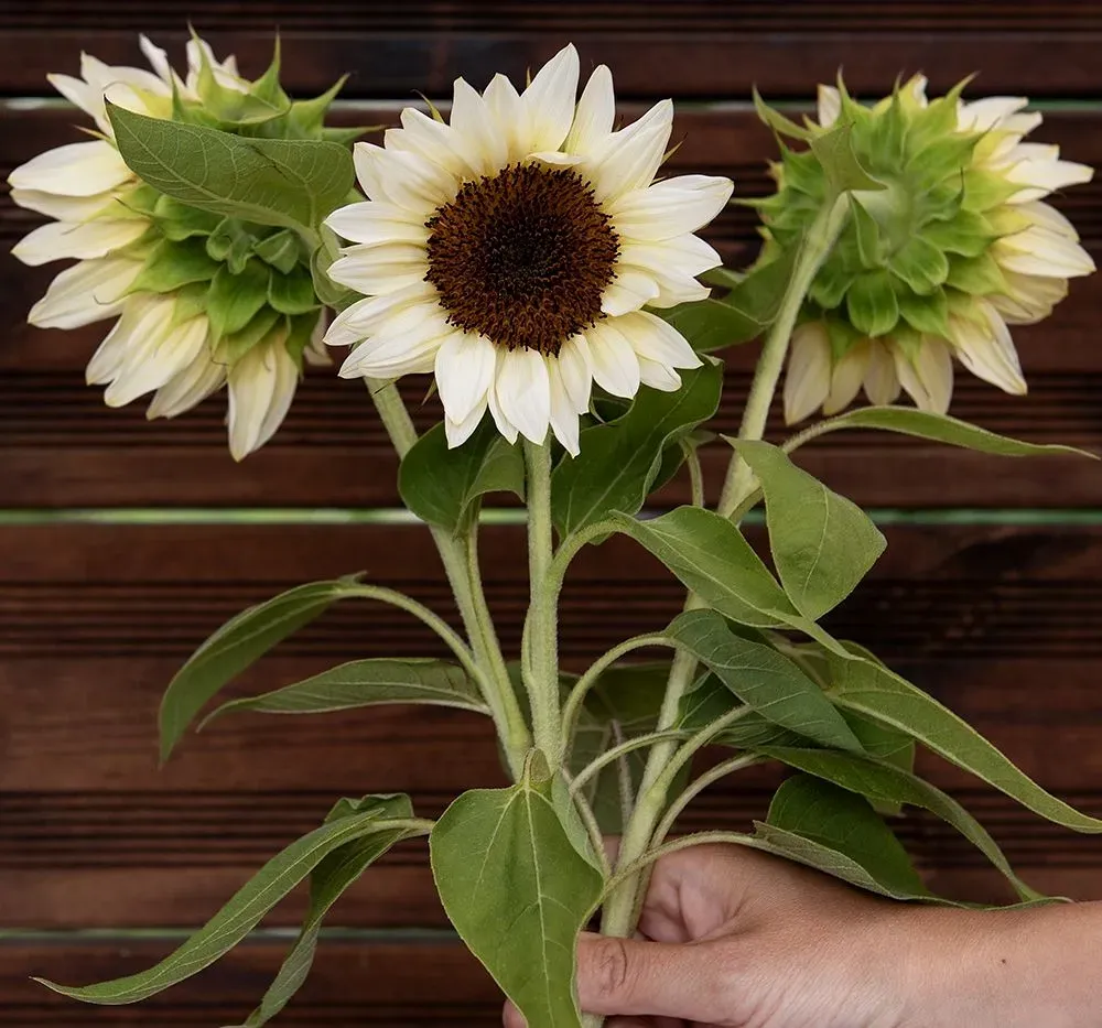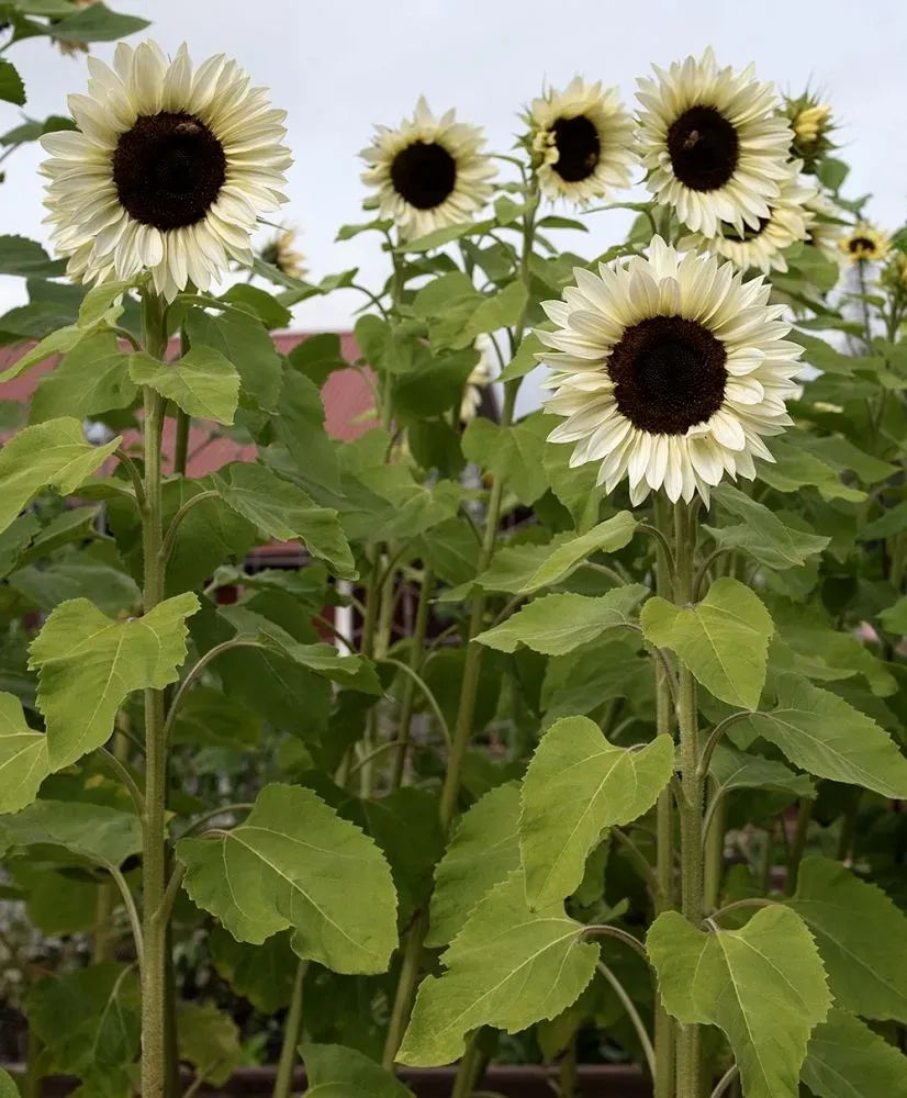 Enkelblommande solros med 15-18 cm stora, cremevita blommor med mörk mitt på höga, raka stjälkar. Grenar sig sällan, perfekt i långstjälkiga buketter. Fin som bakgrundsväxt i sommarrabatter, mot väggar eller murar och till snitt.