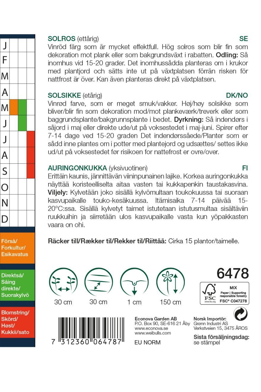 Vinröd färg som är mycket effektfull. Hög solros som blir fin som dekoration mot plank eller som bakgrundsväxt i rabatten. Odling: Så inomhus vid 15-20 grader. Det inomhussådda planteras om i krukor med plantjord och sätts inte ut på växtplatsen förrän risken för nattfrost är över. Kan även planteras direkt på växtplatsen. Mer information Artikel nr: 6478 Såperiod: Maj-Juni Blomningstid: Juli-Sep Växtsätt: Fristående Höjd: 150 cm Plantavstånd: 30 cm Radavstånd: 30 cm Planteringsdjup: 1 cm Namn: Helianthus annuus Räcker till: Ca. 15 plantor Färg: Röd