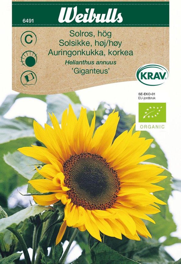 Klassisk hög solros med gula blommor. Utmärkt som dekoration vid plank eller spaljé. Sorten kan bli mycket hög efter flitig vattning och gödsling. Fröna uppskattas av vinterfåglar.