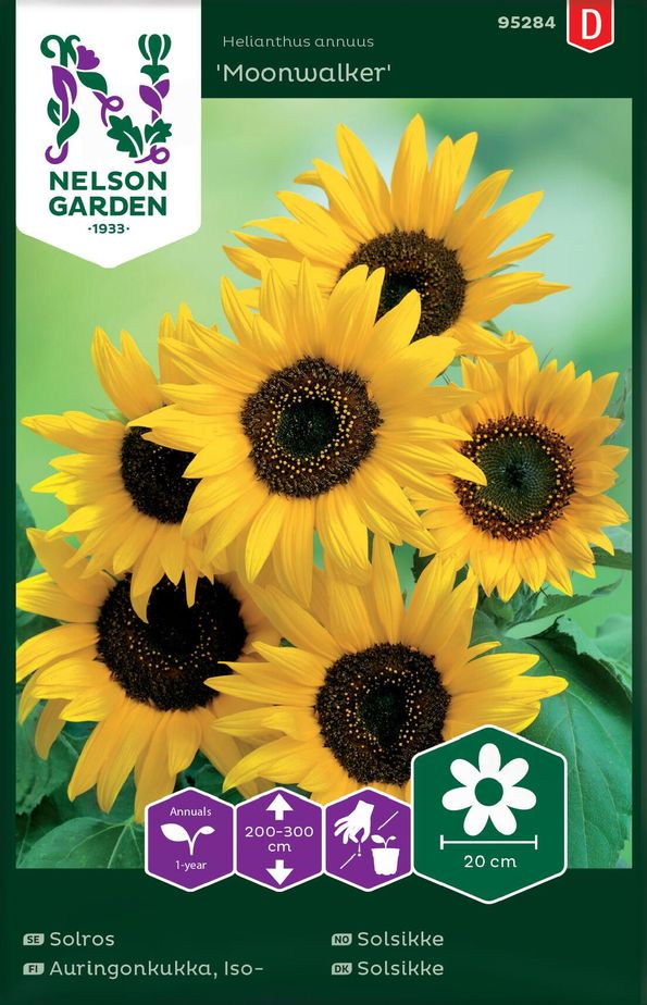 Solros 'Moonwalker' är en buskig variant av solros där varje planta förgrenar sig och täcks med 6-10 intensivt citrongula blommor med mörkbrun mitt. Sorten blir 2-3 meter hög och blommorna upp till 20 cm i diameter. Perfekt sort att kombinera till både snitt och rabatt eftersom man kan skörda snittblommor utan att offra hela plantan. Solrosor står länge i vas och kan lätt kombineras med andra blommor till praktfulla arrangemang. För att nå sin fulla potential och blomma hela perioden juli- september behöver plantorna mycket näring och vatten och de växer helst i soliga lägen. I blommornas mitt finns solrosfrön som uppskattas av fåglar efter blomningen och plantorna kan därför gärna stå kvar i rabatten eller klippas av och hängas upp åt fåglarna på lämpligt ställe i trädgården. 'Moonwalker' är vacker att odla bland både perenner och ettåriga sommarblommor och kan gärna planteras intill plank eller husfasad för att skapa en blomstande kontrast. Solrosor kan både direktsås och förodlas inomhus.