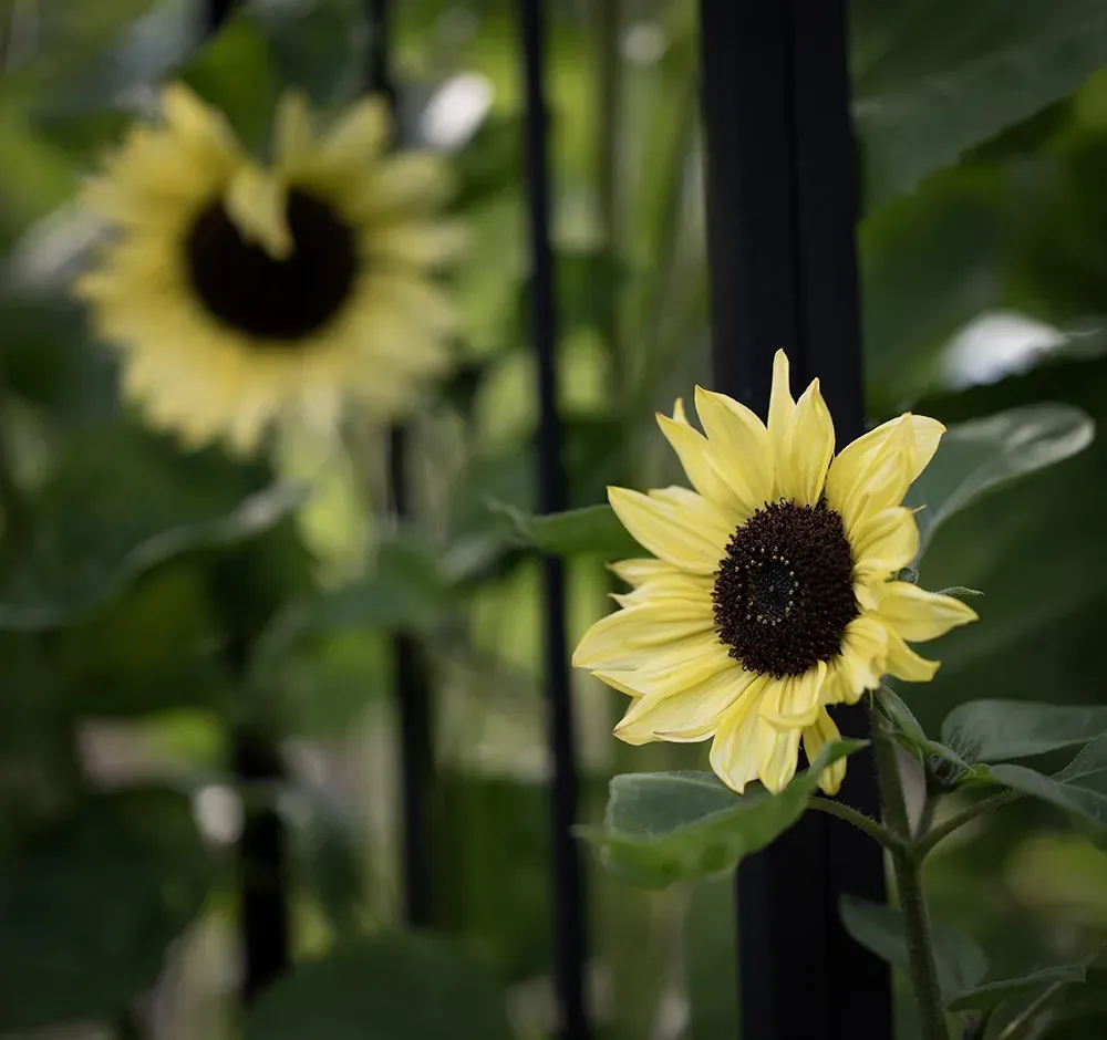 Intressant, prisbelönad solros som grenar sig redan från basen. Många stora blommor på varje planta, ljust solgula med svart mitt. Fin rabatt- och snittsort.