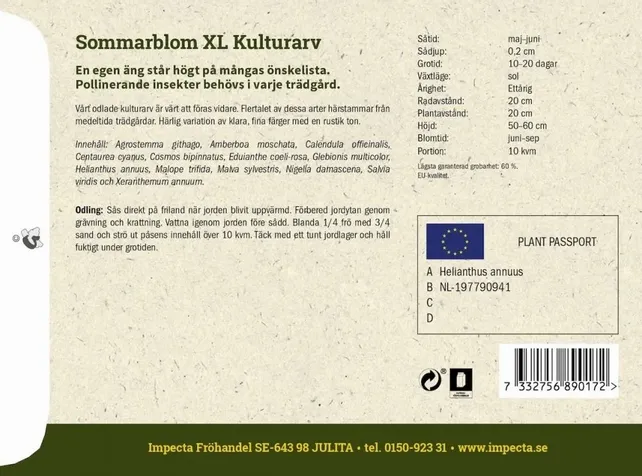 Vårt odlade kulturarv är värt att föras vidare. Flertalet av dessa arter härstammar från medeltida trädgårdar. Härlig variation av klara, fina färger med en rustik ton. Innehåll: Klätt (Agrostemma githago), Doftklint (Amberboa moschata), Ringblomma (Calendula officinalis), Blåklint (Centaurea cyanus), Rosenskära (Cosmos bipinnatus), Nejlikglim (Eduianthe coeli-rosa), Brokkrage (Glebionis multicolor), Solros (Helianthus annuus), Praktmalva (Malope trifida), Rödmalva (Malva sylvestris), Jungfrun i det gröna (Nigella damascena), Broksalvia (Salvia viridis) och Pappersblomster (Xeranthemum annuum).