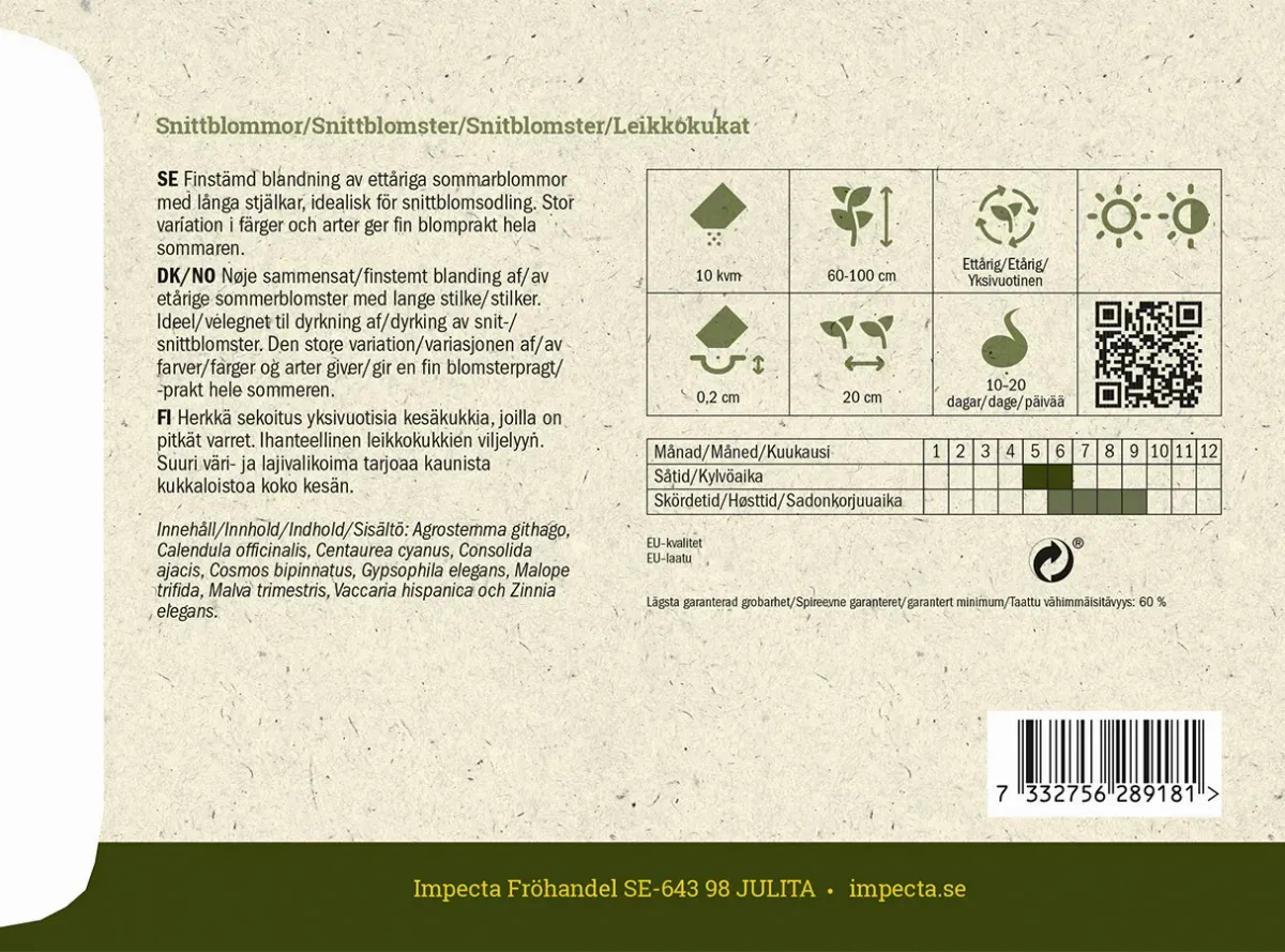 Finstämd blandning av ettåriga sommarblommor med långa stjälkar, idealisk för snittblomsodling. Stor variation i färger och arter ger fin blomprakt hela sommaren.Innehåll: Klätt (Agrostemma githago), ringblomma (Calendula officinalis), blåklint (Centaurea cyanus), romersk riddarsporre (Consolida ajacis), rosenskära (Cosmos bipinnatus), sommarslöja (Gypsophila elegans), praktmalva (Malope trifida), sommarmalva (Malva trimestris), åkernejlika (Vaccaria hispanica) och zinnia (Zinnia elegans).