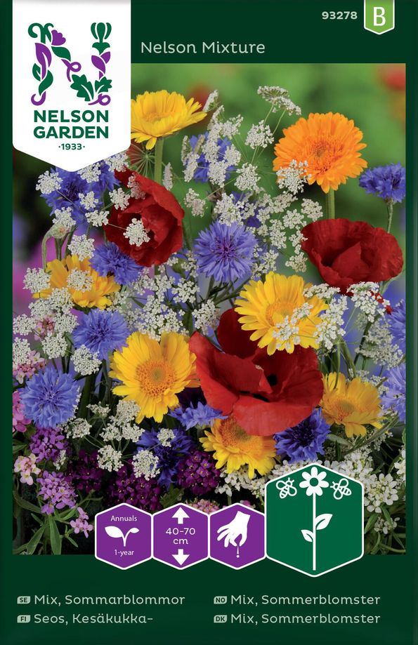 Sommarblomsmix Nelson Mixture är en omtyckt blandning av några av våra mest älskade ettåriga sommarblommor. Blandningen innehåller sommarblommor i blandade färger med sorter som till exempel blåklint, ringblomma, aster, zinnia och romersk riddarsporre. Sorterna är omtyckta av pollinatörer och blommorna varierar i höjd från 40-70 cm för ett effektfullt intryck. Fröna direktsås på önskad odlingsplats i april-maj och blommar från juni till september. För ett effektfullt intryck bredsås fröna istället för att så i rader. På så vis skapas en livfull rabatt full av färg.
