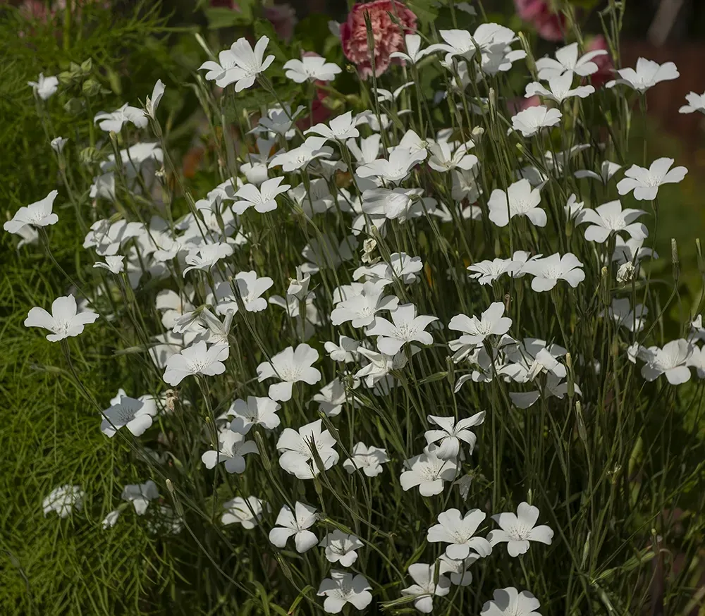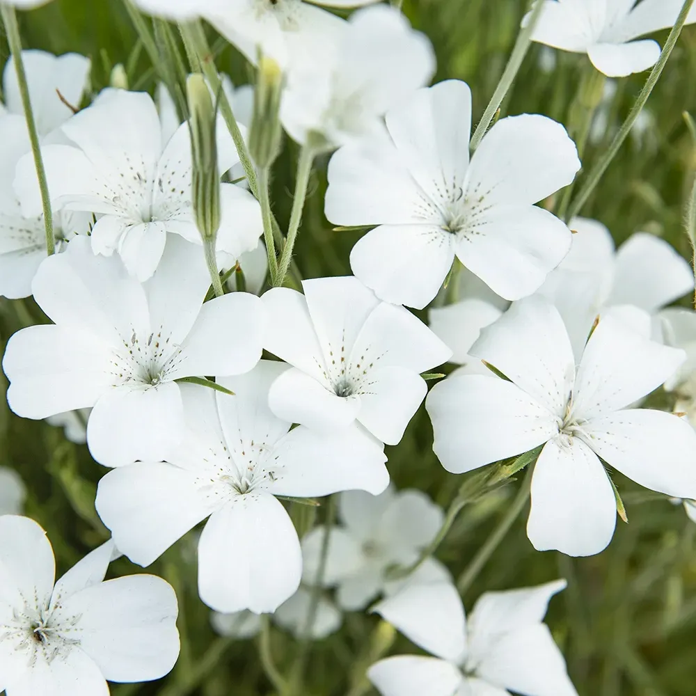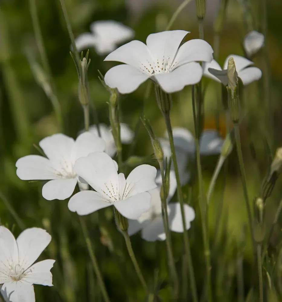 Sidenglänsande, skira, öppna, vita blommor med mörka mittstänk. Stadiga, höga stjälkar som grenar sig i toppen. Vacker och hållbar i rabatt och till snittodling.