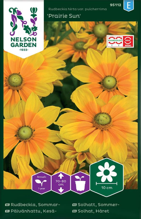 Sommarrudbeckia 'Prairie Sun' är, precis som namnet antyder, en härlig ettårig sommarblomma med stora gula, solliknande blommor. Blommornas kronblad är ljust gula i ytterkanten och guldgula längre in. I mitten centreras blommorna av en ljusgrön knapp som omges av en gul ram. Sorten blir 70-80 cm hög och passar utmärkt i rabatten och buketten. Innan blomstjälkarna sätts i vas klipps blad bort som riskerar att hamna under vattenytan, för att vattnet ska hållas fräscht längre. Sommarrudbeckia är relativt frosttålig och blommar länge på hösten. Sorten trivs bäst i näringsrik och väldränerad jord i soliga odlingslägen. För att förlänga blomningen klipps vissna blommor bort. På så sätt gynnas knoppsättningen vilket ger nya blommor. Sorten förodlas inomhus i mars-april för att sedan blomma i juni-oktober. De stora, lysande blommorna lockar pollinerande insekter.