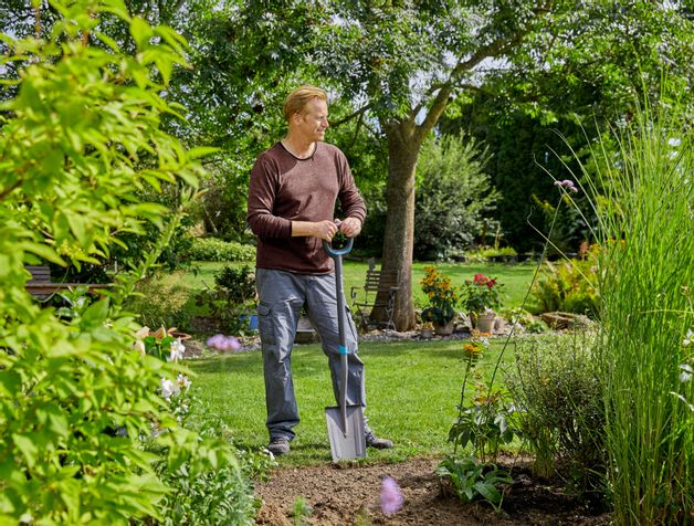 GARDENA ErgoLine-spaden är ett särskilt praktiskt verktyg för att gräva och lyfta ur, luckra upp och flytta jord. Det extra breda och ergonomiskt formade D-handtaget kan bekvämt hållas med båda händerna när som helst för att underlätta arbetet.