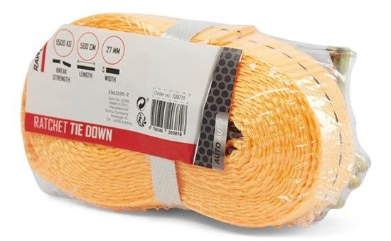 Spännband 450+50 cm × 2,7 cm med spärr och 2 krokar för effektiv surrning av lasten.