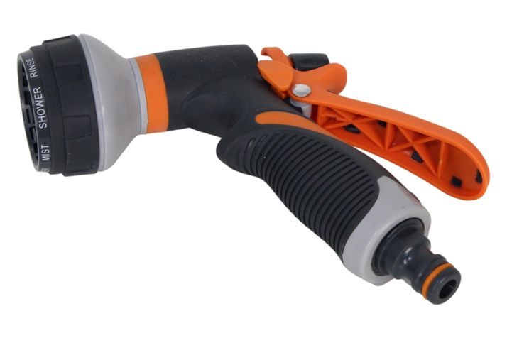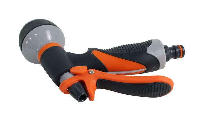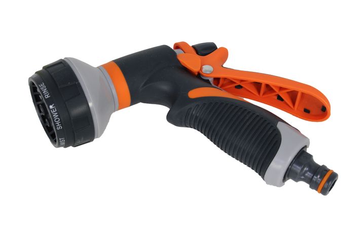 För smidig bevattning och rengöring! Ett mycket prisvärt bevattningsmunstycke i form av en sprutpistol. Den har 8 olika strilfunktioner och är av hög kvalitet och mycket lätt att använda. Pistolen gåräven att låsa i ett läge. Rekommenderat maxtryck är 4 bar och rekommenderad maxtemperatur, 38 grader. Passar med sina många funktioner bra att vattna såväl sådd som stora träd samt att rengöra bil, trädgårdsmöbler och plattsättningen med.