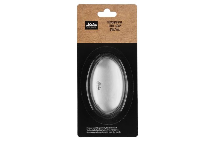 Tvål tillverkad i rostfritt stål. Tar bort obehagliga lukter som fisk och lök. Använd som vanlig tvål.