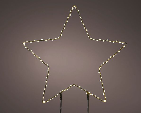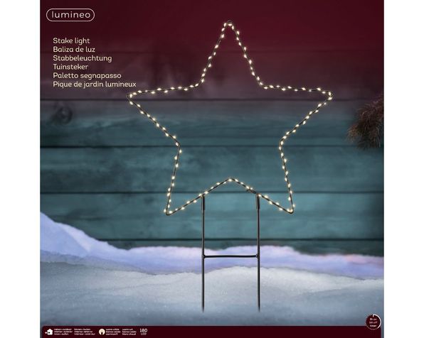 Stjärna med en ljusslinga på 180 varmvita lampor. Stjärnan har inkluderande markspjut som gör det enkelt att placera den i trädgården.