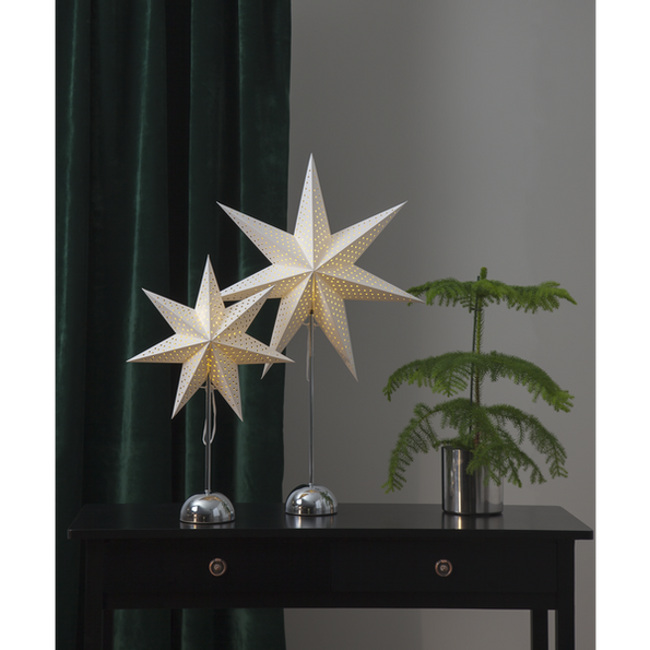 Batteridriven stjärna på fot, vit pappersstjärna med vacker bas i kromfärg. Elegant juldekoration, lätt att placera och passar utmärkt i ett fönster eller på en skänk.