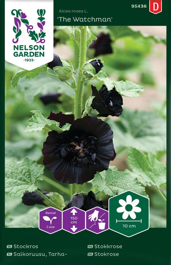 Stora enkla blommor i mörkt rött, nästan svart. Blommar normalt året efter sådd, men kan vid tidig sådd blomma samma år (är då ett-årig). Trivs i näringsrik, fuktighetshållande jord. En ovanligt mörkblommande stockros som blommar i juni, juli och augusti. Blommorna sitter på kraftiga stjälkar som blir uppåt 1,5 meter höga. Höjden gör att de behöver växa med stöd av en vägg, mur eller käpp då de annars är känsliga för blåst. Stockros blommar andra året efter sådd, men kan vid tidig sådd blomma redan samma år (är då ettårig). Blommorna håller sig länge i vas. Stockros trivs i näringsrik, fuktighetshållande jord. De kan få en svampsjukdom som heter rost. Detta motverkas genom att gödsla och mulcha jorden varje år. Visste du att stockrosens blommor är ätliga? De smakar inte så mycket, men är vackra att använda för att dekorera sommartårtor, sallader, isbitar eller drinkar. Egenskaper Latinskt namn: Alcea rosea L. Plantans höjd: 150 cm Livslängd: 2-årig Kännetecken: Pollinatörer Såmetod: Förodling/direktsådd Färg: Svart Mer information Räcker till: 15-20 plantor Växtläge: Sol Plantavstånd: 40 cm Radavstånd: 40 cm Sådjup: 1 cm Förodling: februari – mars Direktsådd: juni – juli Skördetid: juli – september Förodling Blötlägg fröna ett dygn före sådd. Så fröna i fuktad såjord. Ställ sådden i rumstemperatur och håll den fuktig tills fröna har grott. Flytta dem sedan till en plats som är ljus och sval. Vattna gärna underifrån. När plantorna har vuxit så mycket att de går att hantera utan att skadas är det dags att plantera om dem i blomjord, en planta per kruka. Efter sista frost kan plantorna avhärdas och planteras ut. Direktsådd/Plantering Lägg fröna i blöt ett dygn före sådd. Förbered växtplatsen genom att ta bort eventuellt ogräs, pinnar och stenar. Jämna till jorden och vattna såytan. Så fröna och håll jorden fuktig tills de har grott.