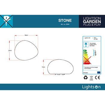 Stone passar till lägre växtlighet med hålrum under bladverket, som exempelvis funkia (hosta), mindre japanska lönnar och ormbunkar. Ljuset tränger igenom växtens grönska och ger ett mysigt sken som förstärker din trädgårds struktur. Du kan även lägga Stone bland andra naturstenar för att skapa mer spänning och liv i utemiljön. På dagtid liknar Stone en riktig sten med sin gråmelerade yta, och på kvällen får den ett varmvitt sken som sprider sig vackert i omgivningen.