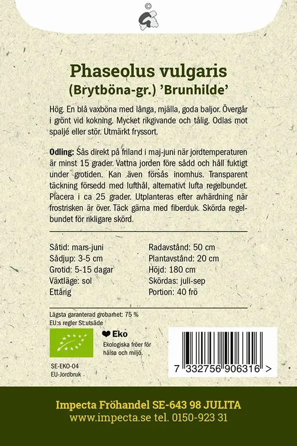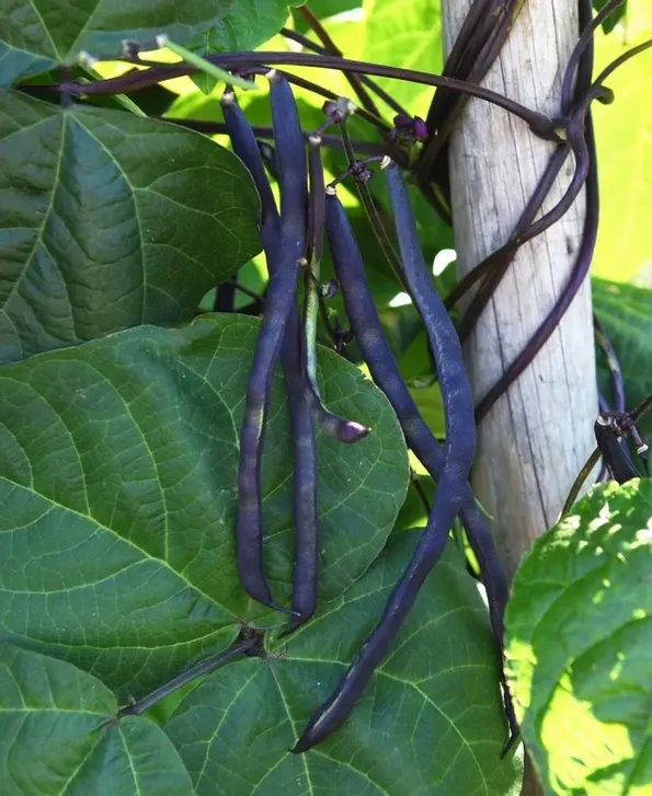 Hög. En blå vaxböna med långa, mjälla, goda baljor. Övergår i grönt vid kokning. Mycket rikgivande och tålig. Odlas mot spaljé eller stör. Utmärkt för infrysning.