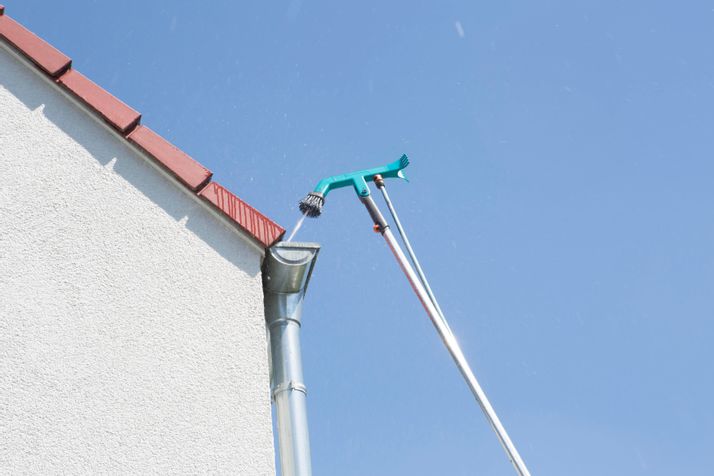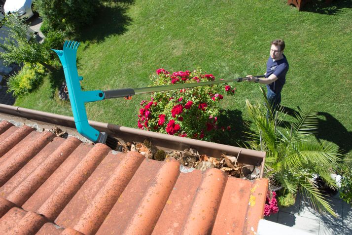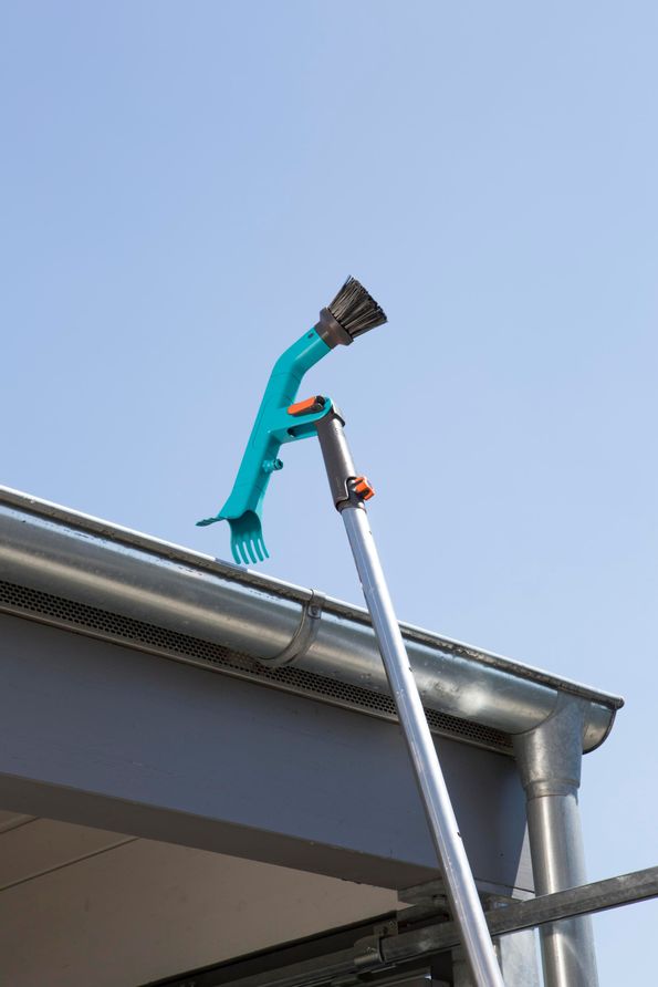 Arbetsvinkeln kan justeras efter behov med hjälp av ett snabbreglage. Takrännerensaren fungerar med alla GARDENA combisystemhandtag, varav ett teleskopiskt handtag rekommenderas för maximal räckvidd (ca 5 m). 25 års garanti.