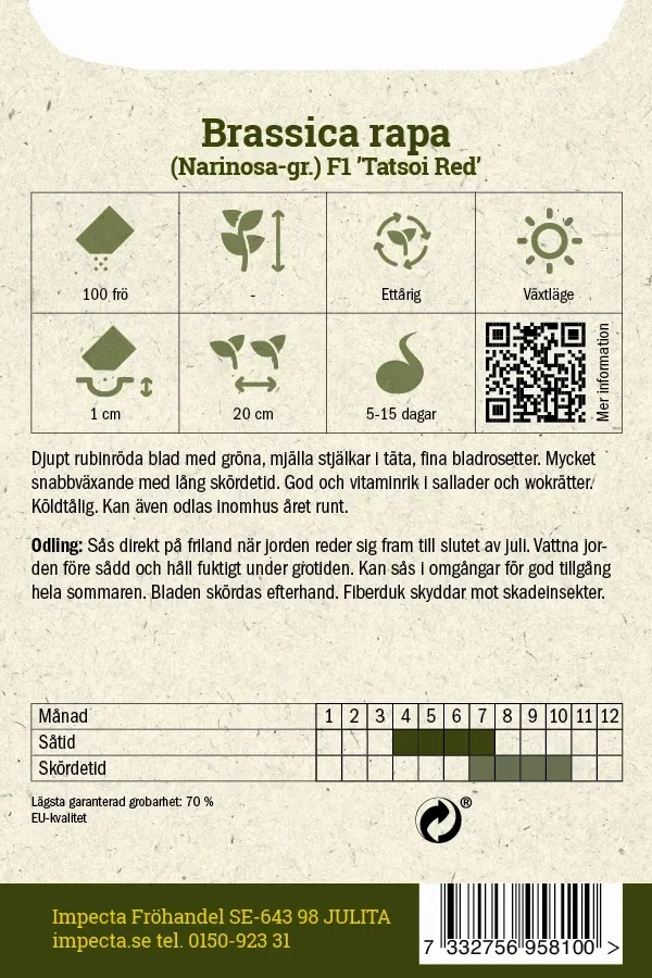 Sås direkt på friland när jorden reder sig fram till slutet av juli. Vattna jorden före sådd och håll fuktigt under grotiden. Kan sås i omgångar för god tillgång hela sommaren. Bladen skördas efterhand. Fiberduk skyddar mot skadeinsekter.