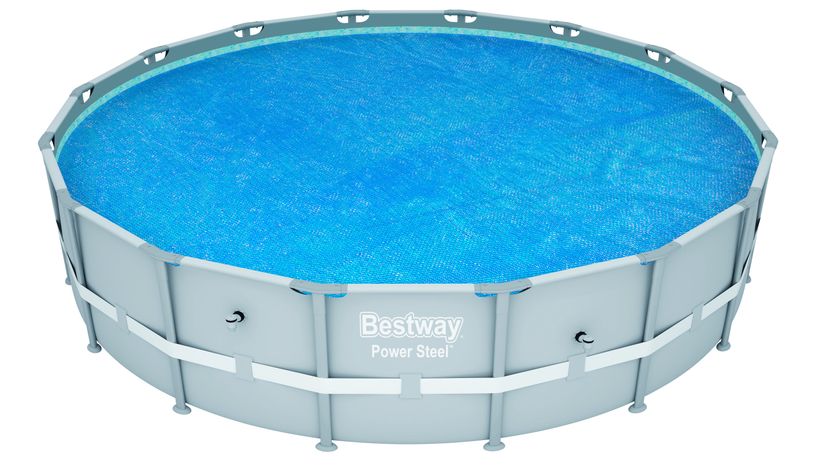Termofolie som läggs över vattnet i poolen när den inte används. Termofolien använder solenergi för att värma upp poolvattnet och hindrar värmen från att försvinna från poolen och bevarar värmen effektivt.